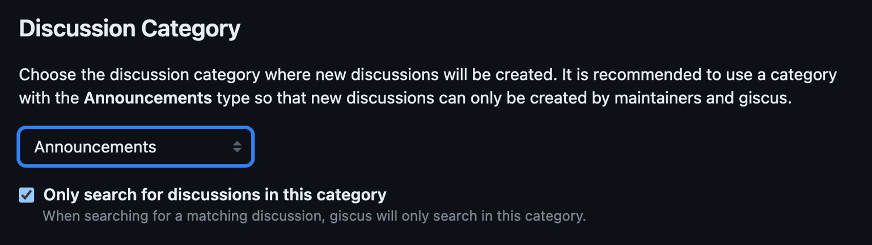 Then, use the Giscus site to figure out what your repoId and categoryId should be. Make sure you select Announcements for the Discussion category.